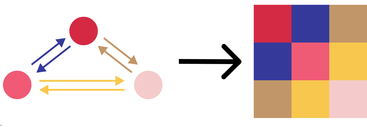 We turn the node features (circles) and messages on the edges (arrows) into the diagonal and off-diagonal entries of the Hessian. Each colour in the Hessian is itself a 3x3 block.