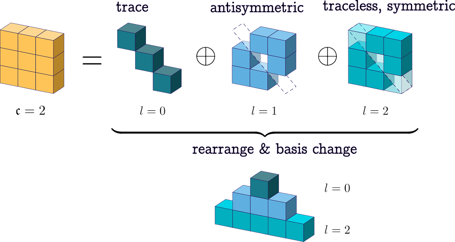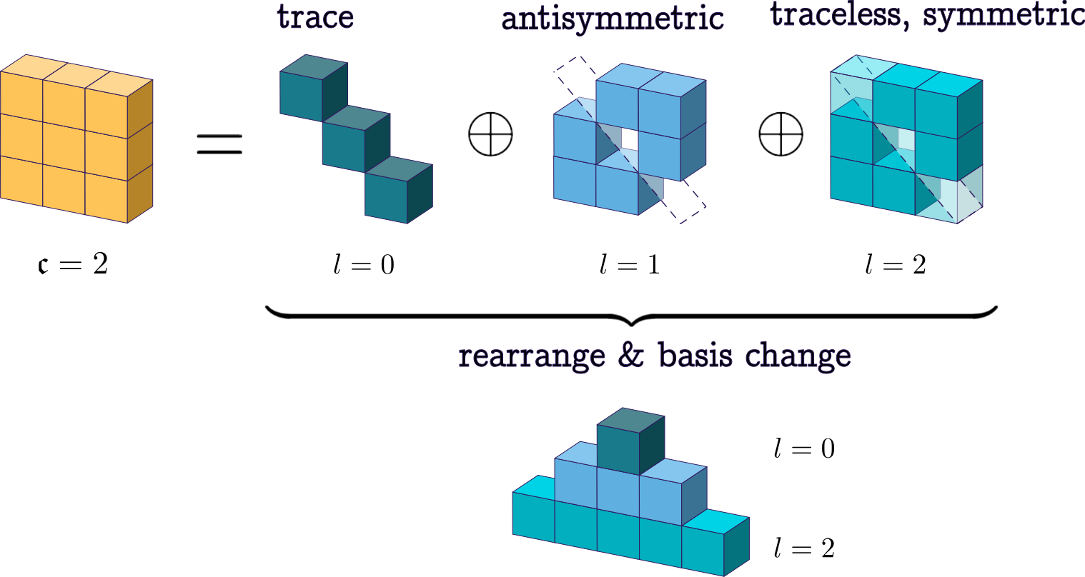 Before jumping into the math, a helpful way to look at this 3x3 block construction is to see the role of each irrep:
