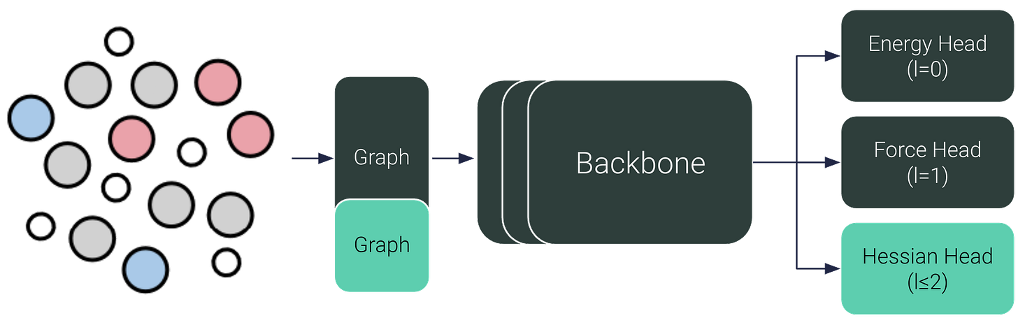 (2) The off-diagonal entries of the Hessian are the interaction between two different atoms. We already have the machinery for learning interactions: message passing. We compute messages (“edge features”) between the atoms, and use them directly instead of summing or otherwise aggregating them.