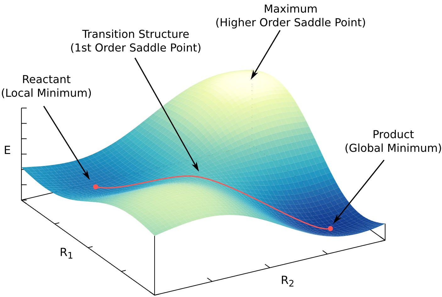 Physical systems prefer low-energy, stable states (think of the Boltzmann distribution: states with lower energy are more populated). Occasionally, a system crosses from one stable state to another, for example, a chemical reaction. The highest point in energy along that path is the transition state (TS).