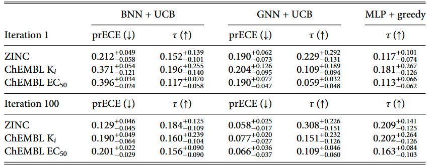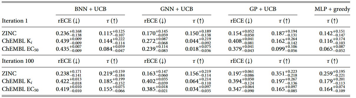 Throughout the BO campaign, we monitor the calibration and ranking ability on a held-out test set. To show the change in the model ability, we show the metrics for the first and last iterations of the BO campaign in Tables 2 and 3.
