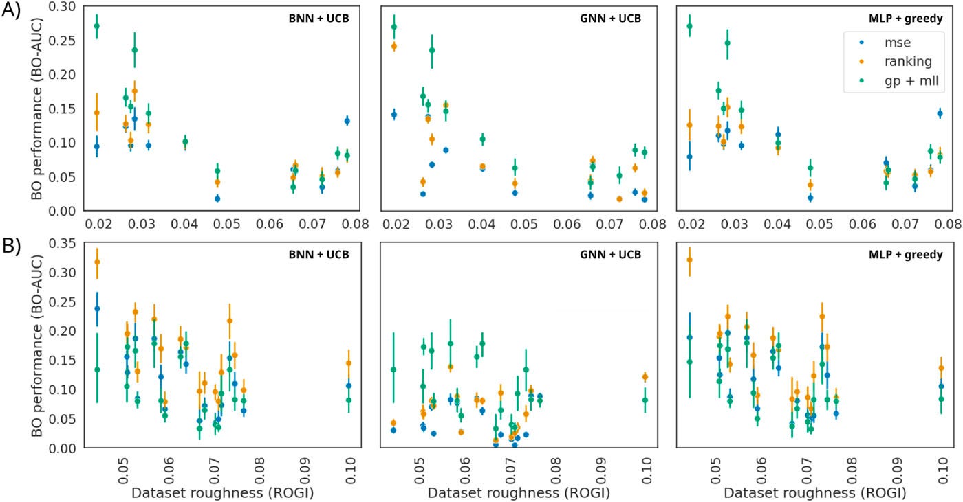 In Figure 3, we plot the BO performance for each of the ZINC tasks as a function of the ROGI of the dataset. The performances are shown for the regression DL surrogates, their ranking counterparts, and the GP surrogate. Across the ZINC tasks, ranking-trained deep models often achieve higher BO-AUC than their regression-trained counterparts, finding more of the top-100 molecules sooner.