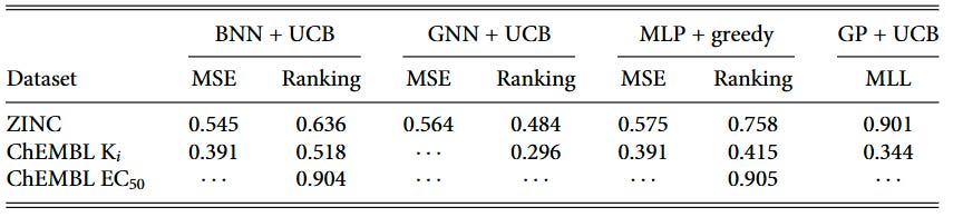 Representations: ECFP (2048, r = 3) for MLP/BNN; GP with a Tanimoto kernel on ECFP is a strong baseline.