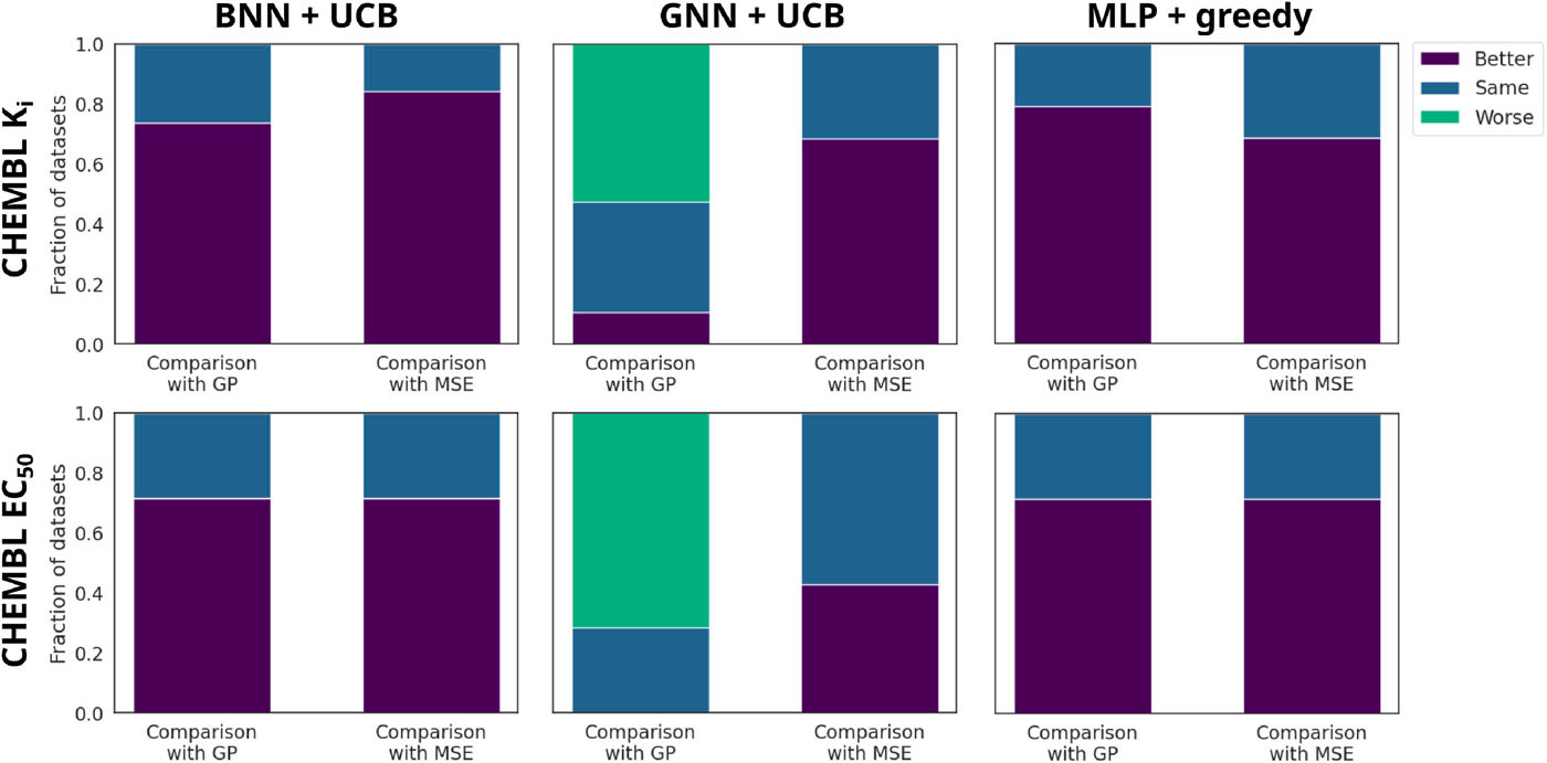On MoleculeACE datasets—which are rich in activity cliffs—ranking models frequently outperform their regression counterparts and often match or exceed GP performance for BNN and MLP surrogates. In Figure 4, we show the fraction of datasets in which the ranking models peform better, the same, or worse than their regression counterparts and the GP surrogate. While GNNs still struggle overall on these challenging datasets, ranking training consistently improves their performance over regression training. Statistical tests across all datasets confirm these trends, with ranking models winning on more datasets than they lose.