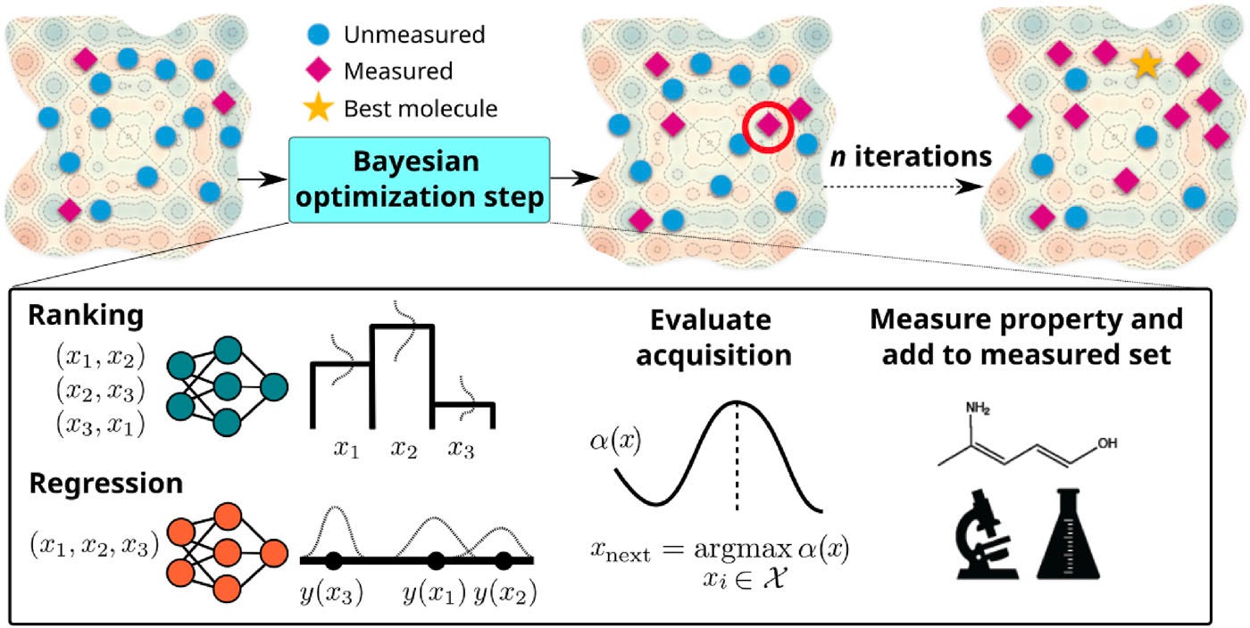 A key challenge is in automated design of experiments, typically done using Bayesian optimization (BO). In BO, the goal is to maximize (or minimize) a black-box function – for instance, the yield or some property of a chemical reaction – with as few experiments as possible. The process works in a loop: the algorithm maintains a surrogate model of the unknown function, updates it with each new data point, and uses an acquisition function to pick the next experiment.