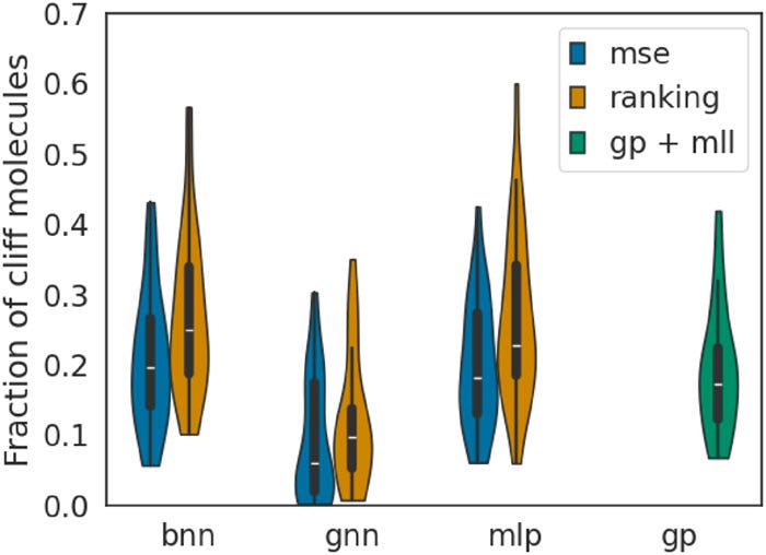 As defined by van Tilborg et al., activity cliffs in the MoleculeACE datasets are labelled by cliff-pair molecules. To see how well the surrogates handle the activity cliffs, we look at the fraction of top-100 molecules discovered by our surrogate models. The violin plots in Figure 5 reveal that ranking models identify a larger fraction of cliff molecules among the true top-100 candidates, demonstrating their ability to navigate the discontinuities where optimal molecules often reside.