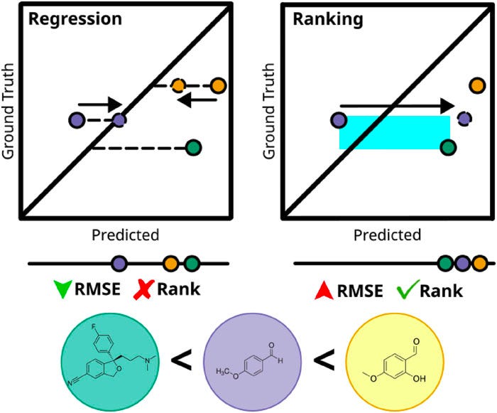 Robust to cliffs and outliers. Activity cliffs make regression hard: a few extreme points can pull the scale around, leading to large losses that affect the training of regression models. And more importantly, these outliers may very well be the optimal molecules we are seeking. If the regression model manages to minimize the average root mean squared errors (RMSE), it would all be for naught if it didn’t get the relative ranking correct.